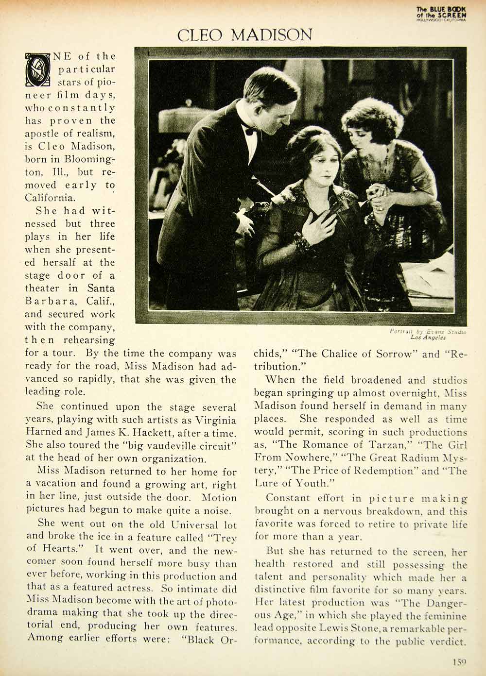 This is an original 1923 two-page black and white halftone print with a full-page portrait and a brief biographical sketch of silent film actress, director, and writer, Cleo Madison (1883-1964) whose films include "The Trey o' Hearts" (1914), "Black Orchids" (1917), "The Chalice of Sorrow" (1916), "The Romance of Tarzan" (1918), "The Girl From Nowhere" (1919), "The Great Radium Mystery" (1919) "The Price of Redemption" (1920), "The Lure of Youth" (1921), and "The Dangerous Age" (1923). Please see both images.