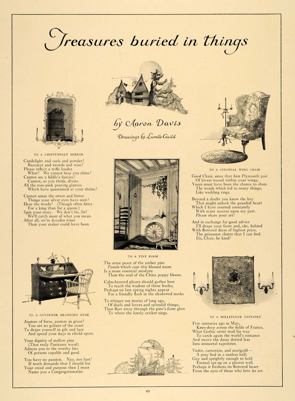 This is an original 1923 halftone print that features poetry by Aaron Davis. Each poem is dedicated to a piece of furniture-- a Chippendale mirror, a colonial wing chair, a pine room, a Governor Bradford Desk, and a millefleur tapestry. The images were drawn by Lurelle Guild.