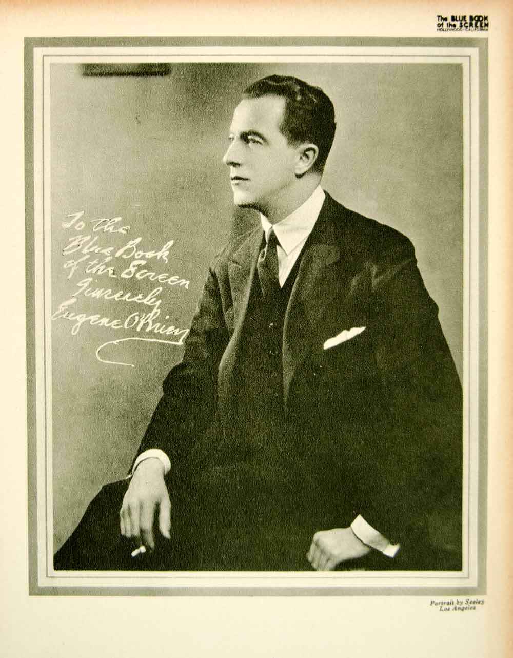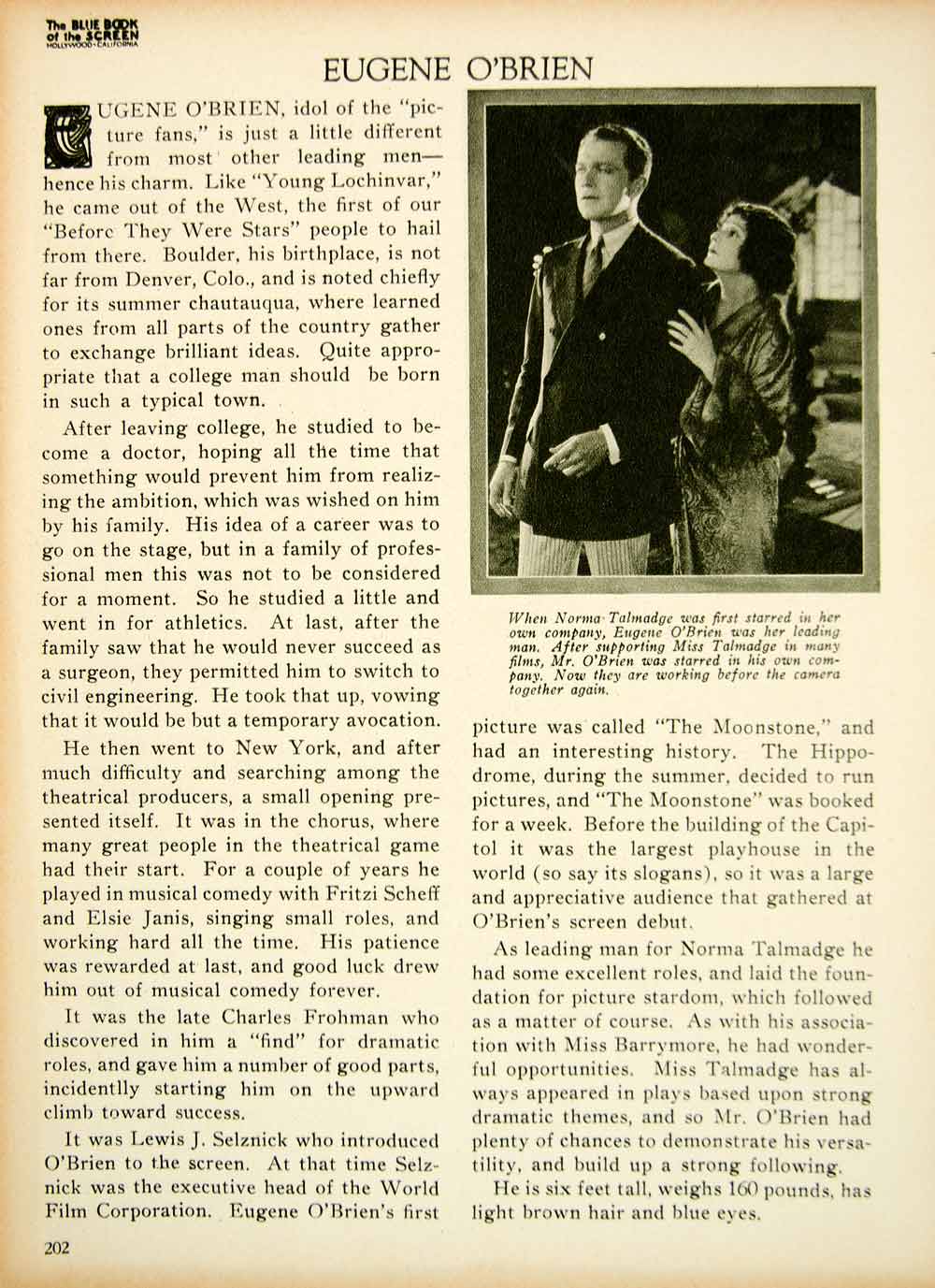 This is an original 1923 two-page black and white halftone print with a full-page portrait and a brief biographical sketch of silent film actor, Eugene O'Brien (1880-1966) whose first picture was "The Moonstone" (1915). He was a leading man to Norma Talmadge and other female stars of the silent film era in subsequent films. Please see both images.