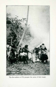 This is an original 1923 black and white halftone print of Firewalkers of the Fiji Islands preparing the fire pit.