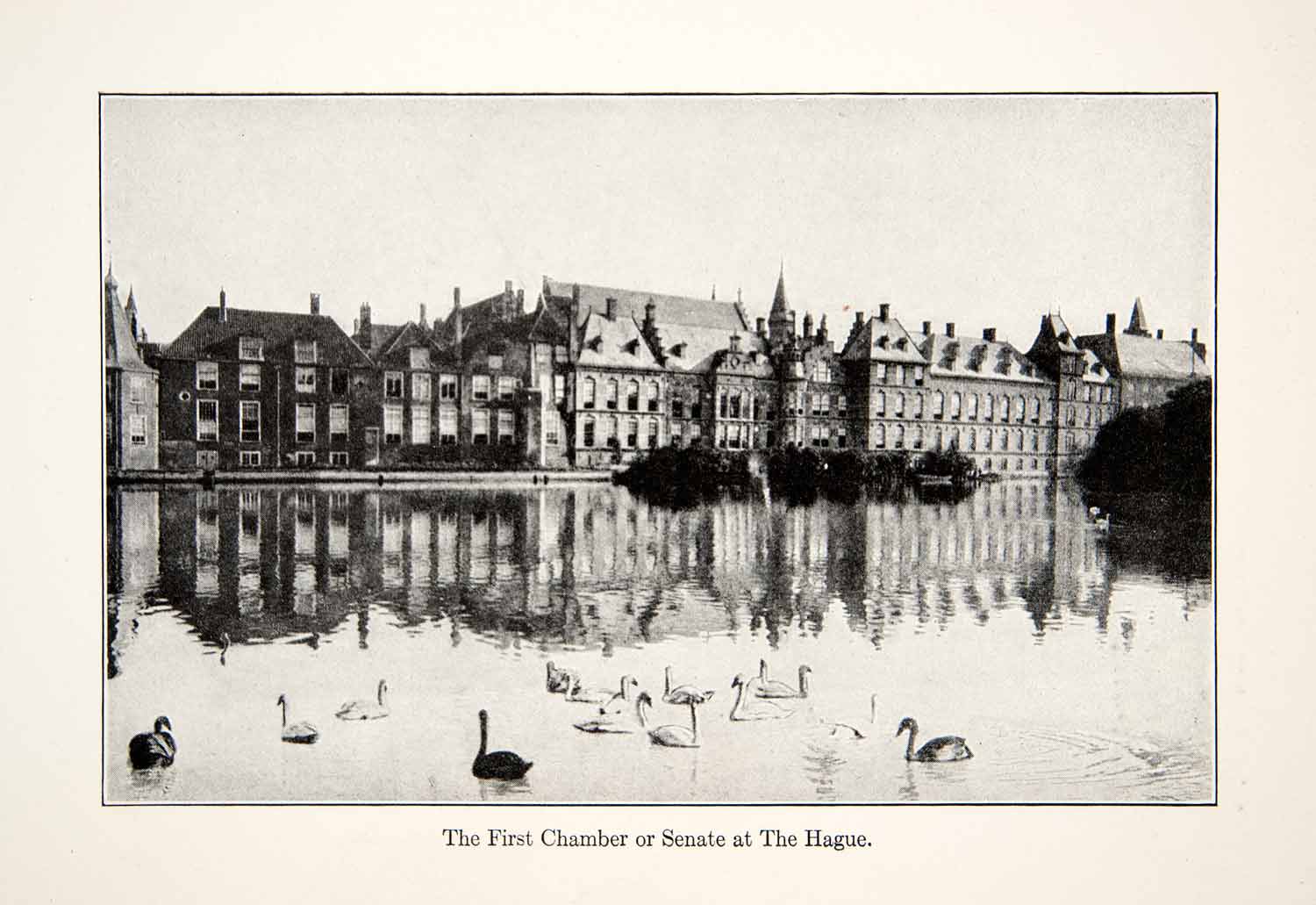 This is an original 1923 black and white halftone print of the First Chamber of the Senate in the Hague, Netherlands.