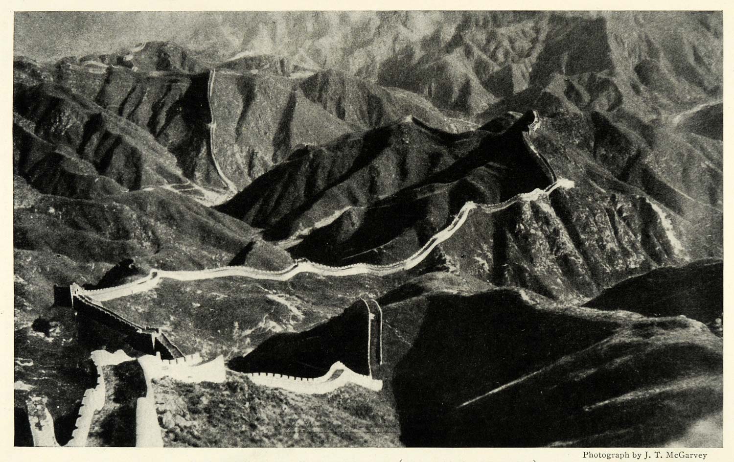This is an original 1923 halftone print of the Great Wall of China at Nankow Pass, one of the two passes of the Juyongguan or Juyong Pass. This print shows the section of the Long Rampart which was most familiar to the tourist. This pass was a much-used caravan route from China into Mongolia. The Great Wall of China consist of a series of stones and fortifications situated in northern China. It was designated by the UNESCO was World Heritage Site in 1987. Photograph by J. T. McGarvey.