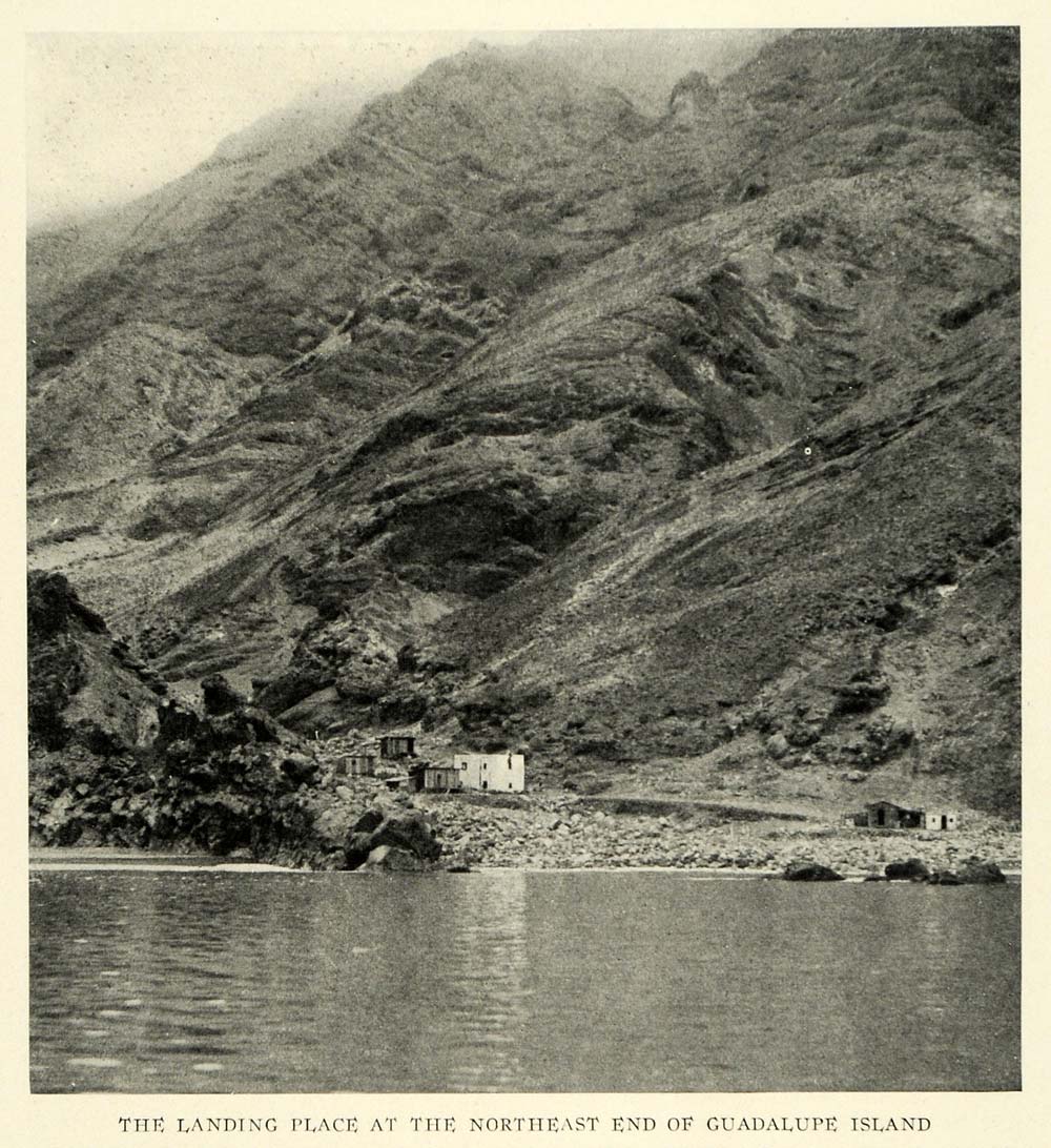 This is an original 1923 halftone print of the landing place at the Northeast end of Guadalupe Island in Mexico. The white building was erected as barracks when the Mexican Government had soldiers statioined on the island. Most of the other buildings were used by persons in the goat ranch industry.