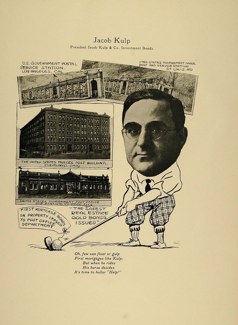 This is an original 1923 black and white print of Jacob Kulp who issued first mortgage bonds on property leased by the U.S. Post Office Department in Los Angeles, CA, St. Louis, MO., Cleveland, OH and Chicago, IL.