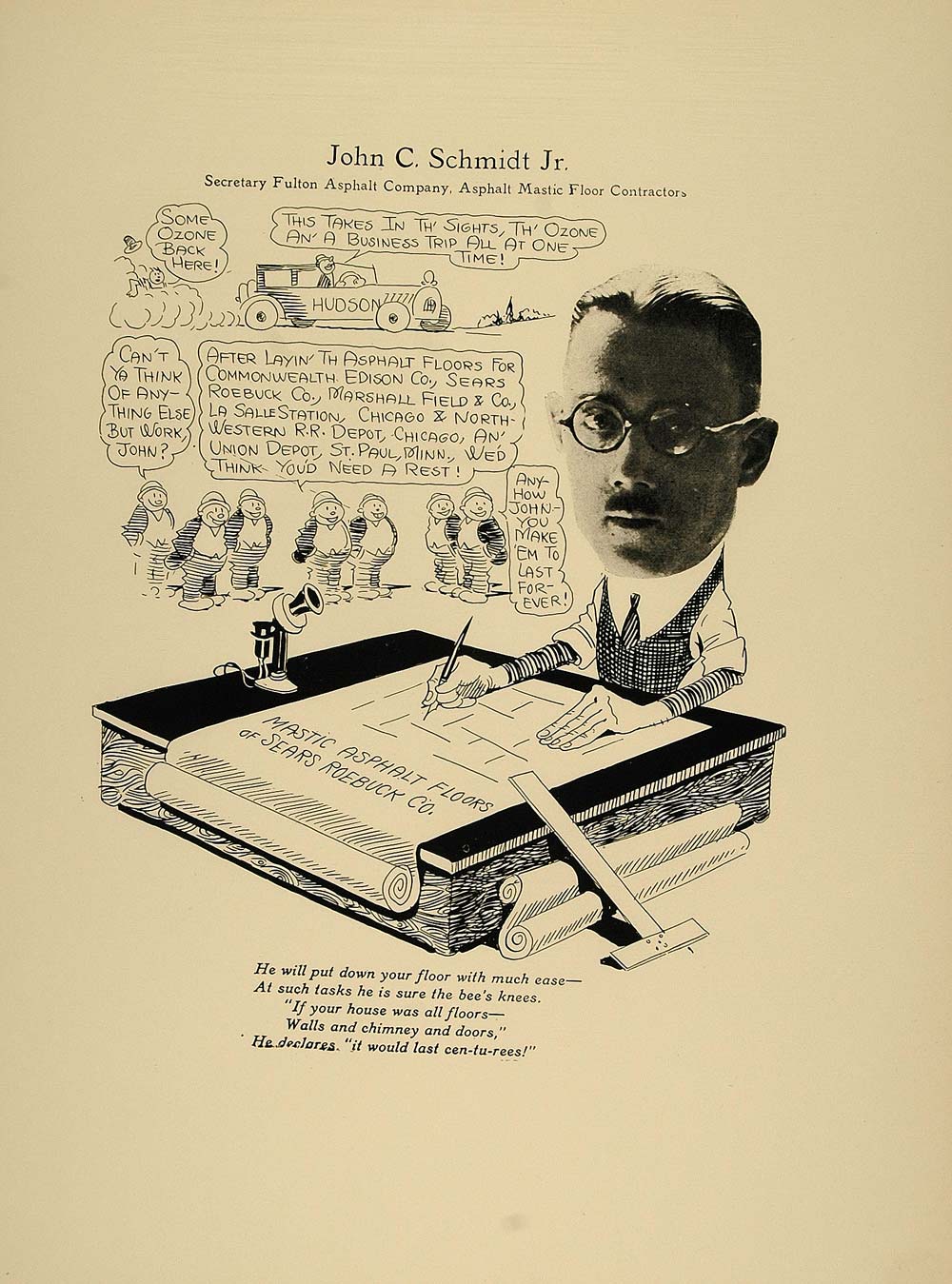 Period Paper has obtained an unusual collection of prints with character sketches of Chicago movers and shakers from the 1920's. These men (yes, they are all male) were active in the business, industrial, and professional life of the city, and they are depicted here in a cartoon-style format with an illustrative and humorous verse by J. P. McEvoy.