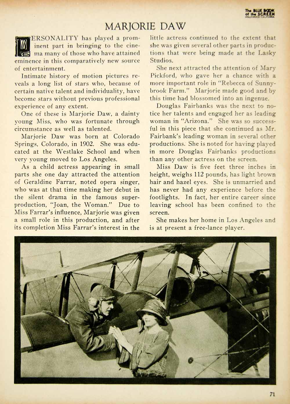 This is an original 1923 black and white halftone print with an image and a brief biographical sketch of silent film actress, Marjorie Daw (1902-1979) who appeared in "Joan, the Woman," "Rebecca of Sunnybrook Farm," "Arizona," and many other films.
