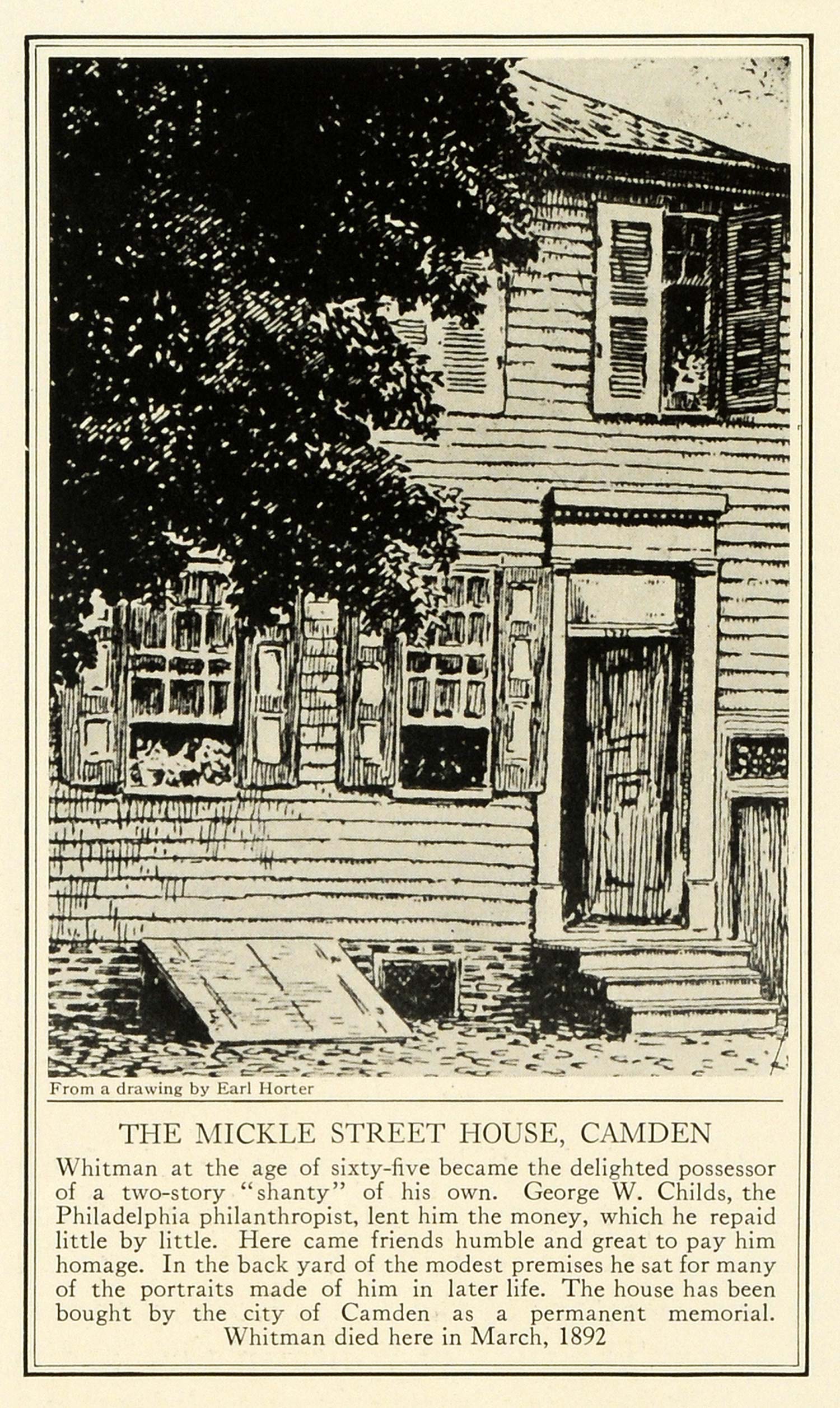 This is an original 1923 halftone print of Walt Whitman's home on Mickle Street in Camden, New Jersey. Walt Whitman, famous poet and author of "Leaves of Grass," is remembered for his poetry and for his love of Abraham Lincoln. The caption writes, "Whitman at the age of sixty-five became the delighted possessor of a two-story 'shanty' of his own. George W. Childs, the Philadelphia philanthropist, lent him the money, which he repaid little by little. Here came friends humble and great to pay him homage..."