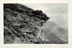 This is an original 1923 black and white halftone print of the bottom of Mt. Stello, with the Corsican town of Nonza in the distance.