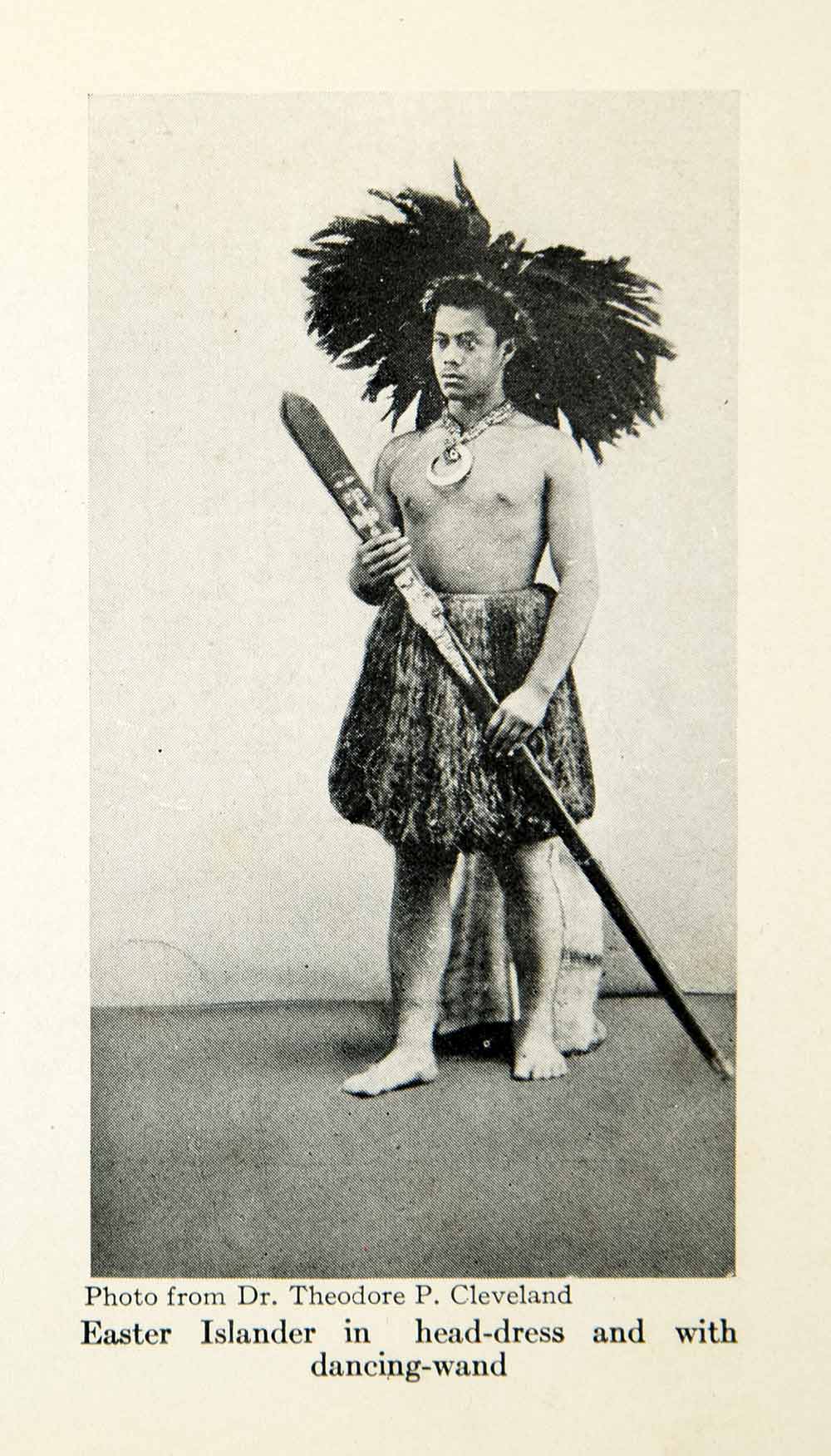 This is an original 1923 black and white halftone print of a portrait of an Easter Islander in his traditional wear and headdress accompanied by a dancing wand.