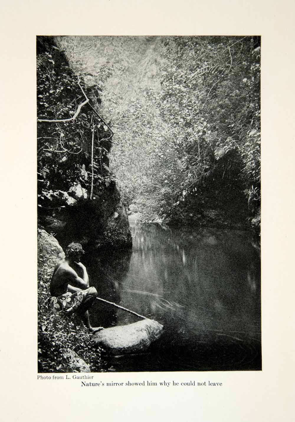 This is an original 1923 black and white halftone print of a man next to a river on a Polynesian Island.