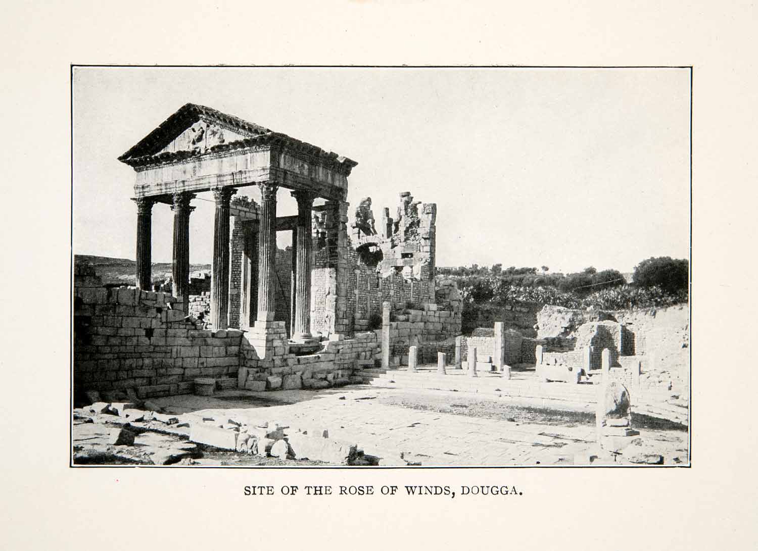 This is an original 1923 black and white halftone print of the Ruins of the Roman Site called Rose of the Winds. It is located in Dougga, which is located in Tunisia.
