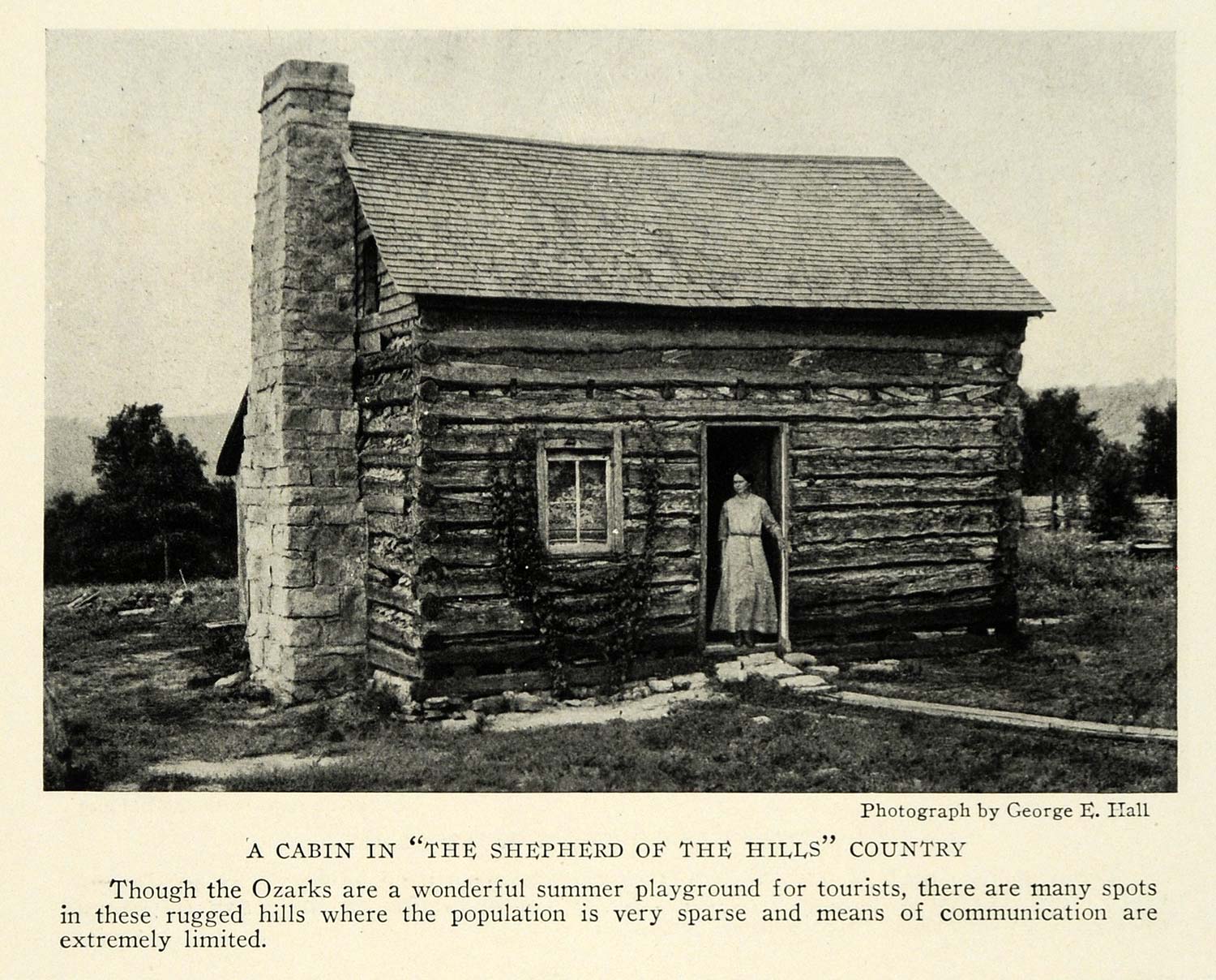 This is an original 1923 halftone print of a cabin in The Shepherd of the Hills Country in Branson, Missouri, Ozarks. Photography courtesy of George E. Hall.