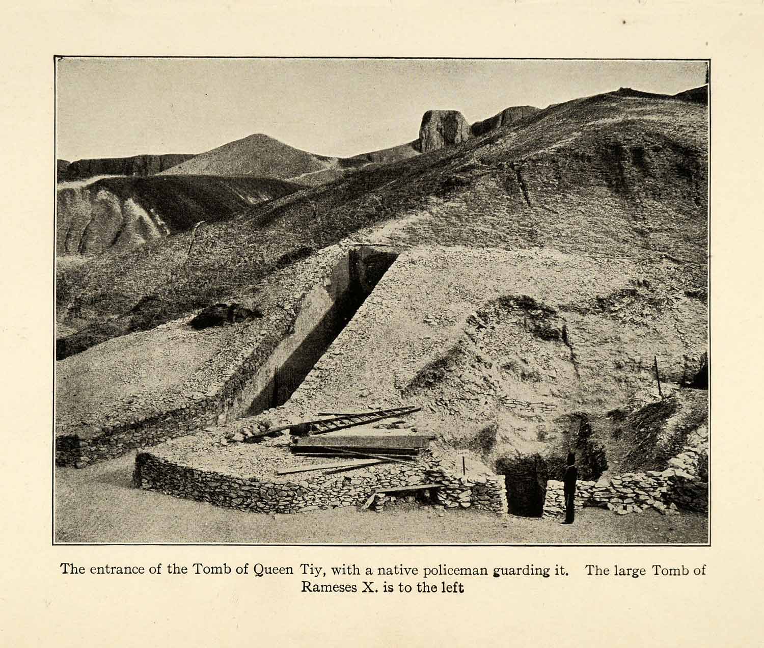 This is an original 1923 halftone print of the entrance to the tomb of Queen Tiy (guarded by an Egyptian policeman) and the tomb of Ramesses X, in the Valley of the Kings.
