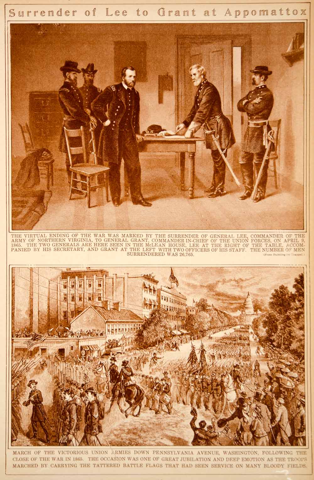 This is an original 1923 sepia rotogravure with two images depicting scenes of the American Civil War: a painting "Lee Surrendering to Grant at Appomattox" by the American painter, Alonzo Chappel (1828�1887); and a sketch of the march of the victorious Union Armies down Pennsylvania Avenue in Washington D.C.