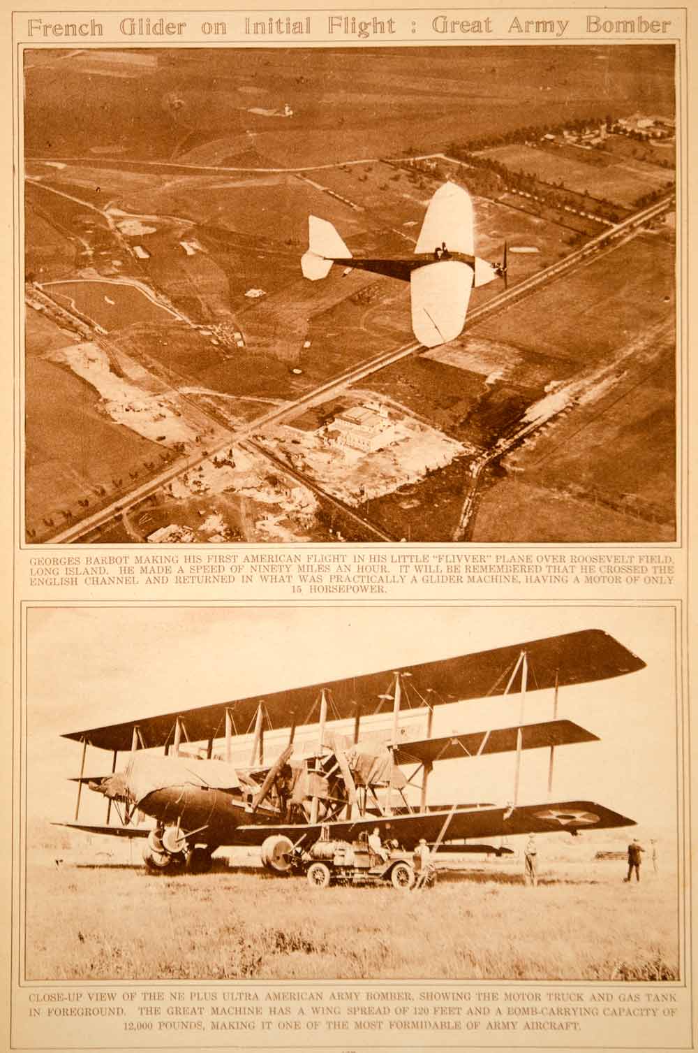 This is an original 1923 sepia rotogravure with images of two early airplanes: aviator Georges Barbot making his first American flight over Roosevelt Field in a glider; and a view of the giant American Army bomber.