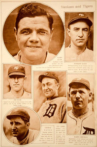 This is an original 1923 sepia rotogravure with portraits of the baseball greats of the New York Yankees and the Detroit Tigers baseball teams: Babe Ruth; Everett Scott; Joe Bush; Ty Cobb; George Dauss; and Harry Heilman.