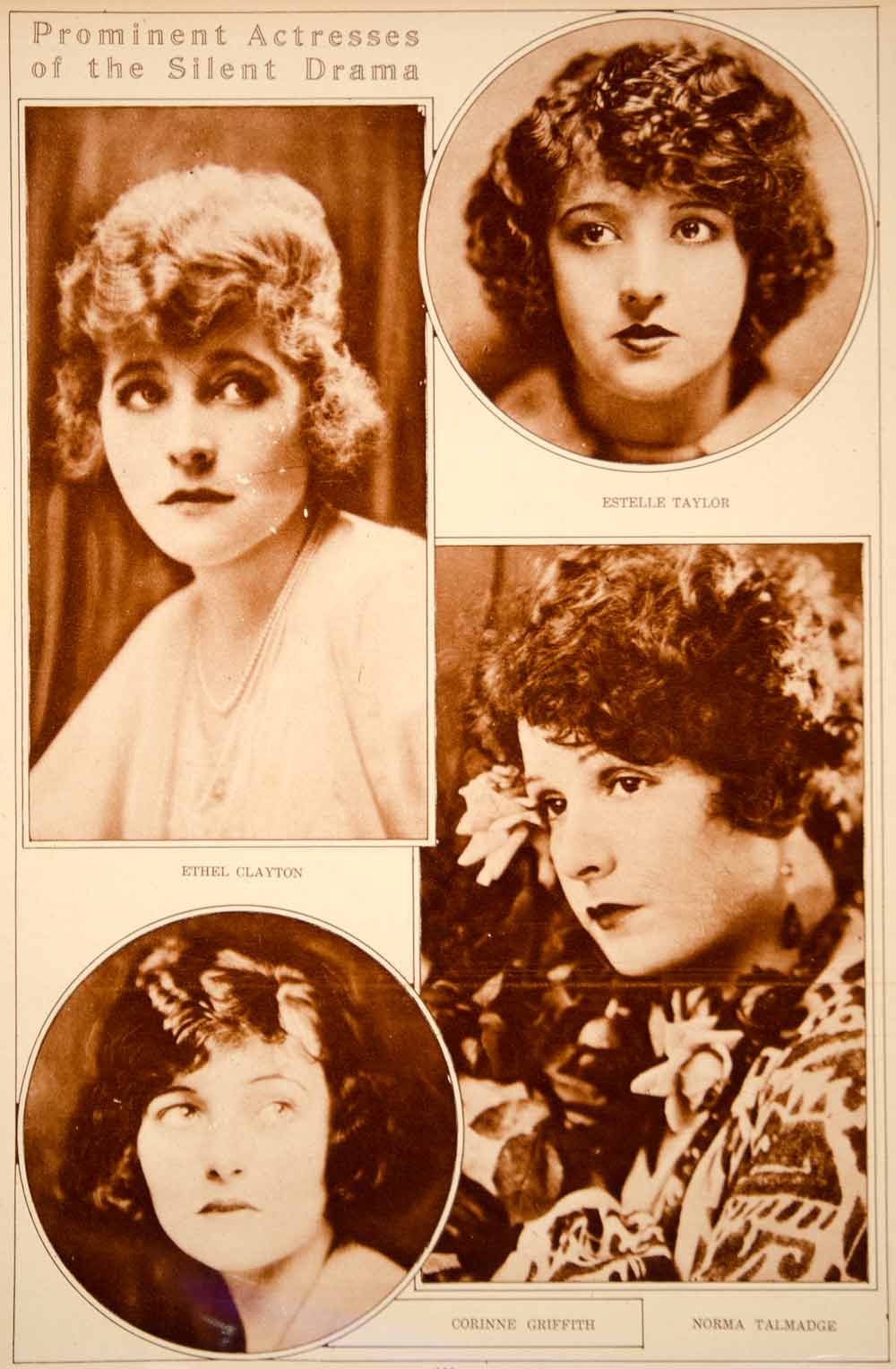 This is an original 1923 sepia rotogravure with portraits of some of the famous actresses of the silent film era: Ethel Clayton; Estelle Taylor; Corinne Griffith; and Norma Talmadge. An excellent, original print item for the collector of early movie memorabilia!