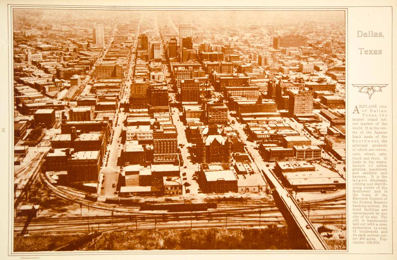 This is an original 1923 sepia rotogravure of an aerial view of Dallas, Texas.