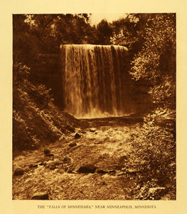 This is an original 1923 sepia Rotogravure of Minnehaha Falls near Minneapolis, Minnesota. The falls have become a popular tourist destination after Henry Wadsworth Longfellow's 1855 publication of