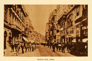 This is an original 1923 sepia Rotogravure of the Grand Rue in Pera, Istanbul, Turkey. Istanbul is the largest city in Turkey, and the third largest metropolitan center in Europe, after London and Moscow. Photography by E. M. Newman.