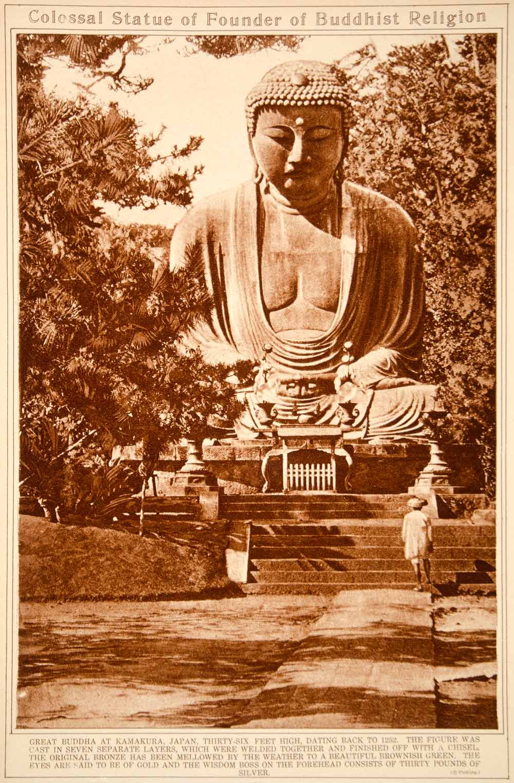 This is an original 1923 sepia rotogravure of the great bronze statue of Buddha at Kamakura, Japan.
