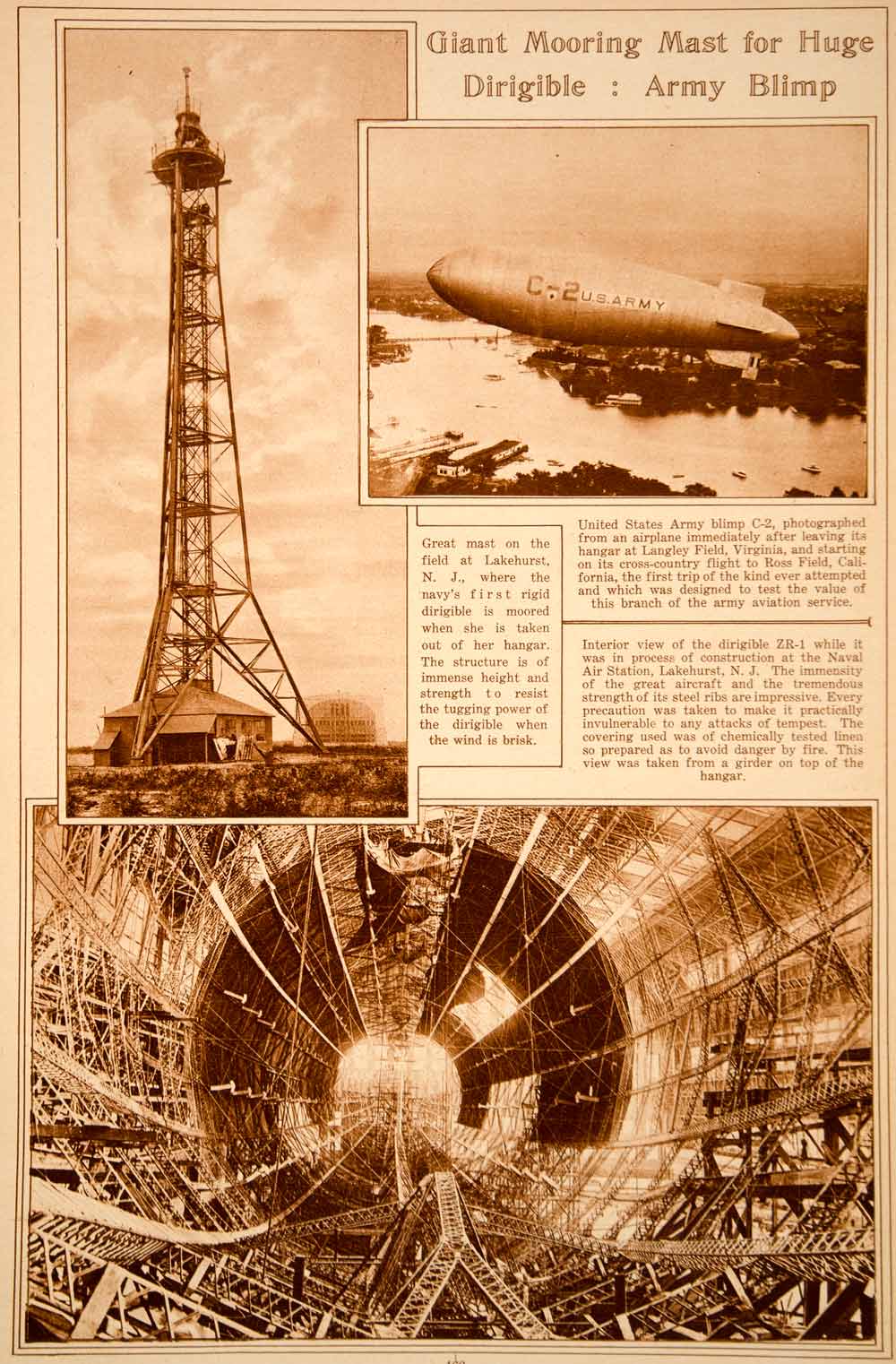 This is an original 1923 sepia rotogravure with three aviation images: the airship mooring mast on the field at Lakehurst, NJ; the U.S. Army blimp C-2; and an interior view of the rigid dirigible ZR-1 (USS Shenandoah) under construction at the Lakehurst Naval Air Station. The mooring mast at the Lakehurst Naval Air Station is notable for later being the site of the German passenger airship Hindenburg disaster on May 6, 1937.