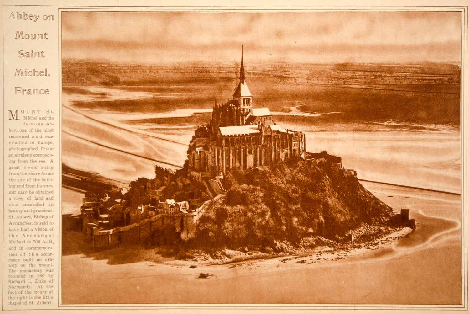 This is an original 1923 sepia rotogravure of Mont-Saint-Michel, the famous island abbey and fortress off the coast of France.