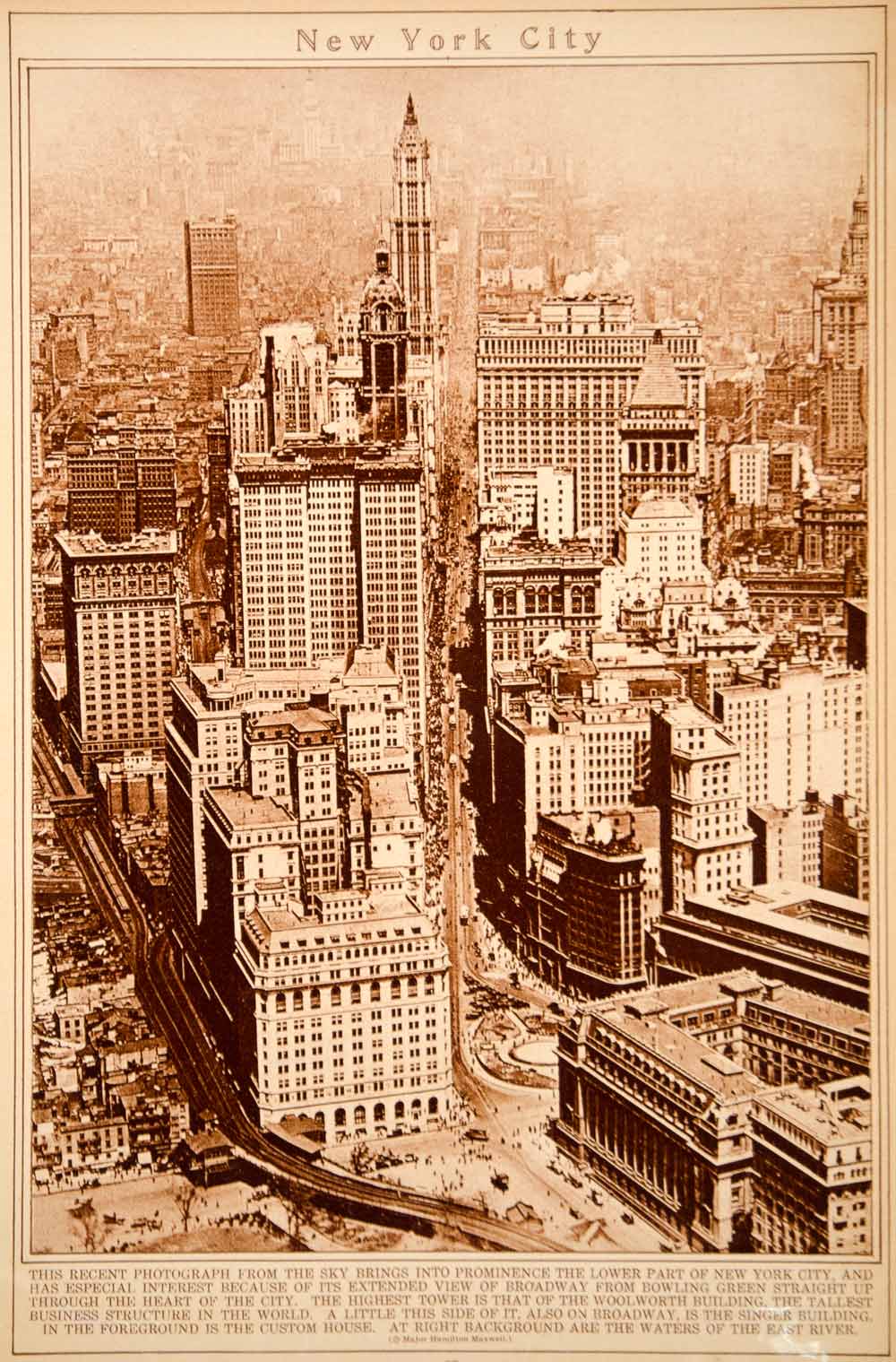 This is an original 1923 sepia rotogravure of an especially nice aerial view of New York City showing Broadway, the Woolworth Building, the Singer Building, and the Custom House.