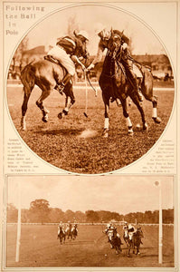 This is an original 1923 sepia rotogravure with two images of polo games: West Point versus Virginia Military Institute; and the All-Ireland Four versus the Shelbourne House Four.