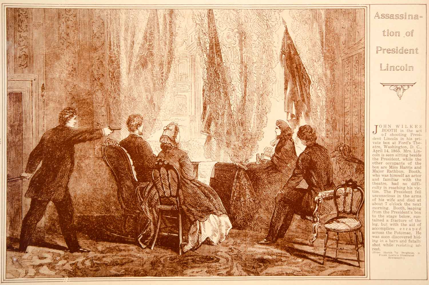 This is an original 1923 sepia rotogravure of a sketch by newspaper artist, Albert Berghaus, of the assassination of President Lincoln by John Wilkes Booth at Ford's Theatre in Washington D.C. on April 14, 1865.