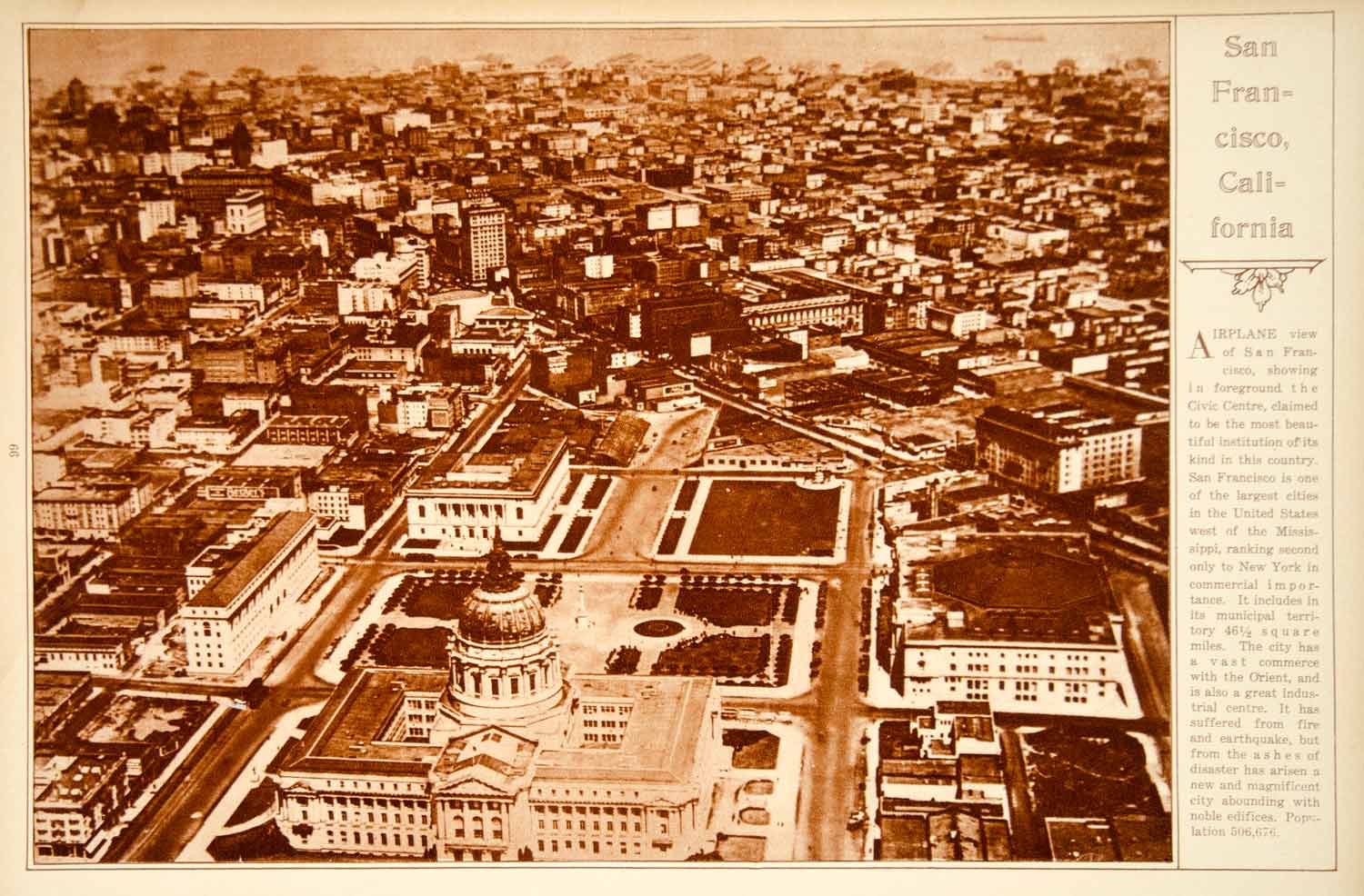This is an original 1923 sepia rotogravure of an aerial view of the center of the city of San Francisco.