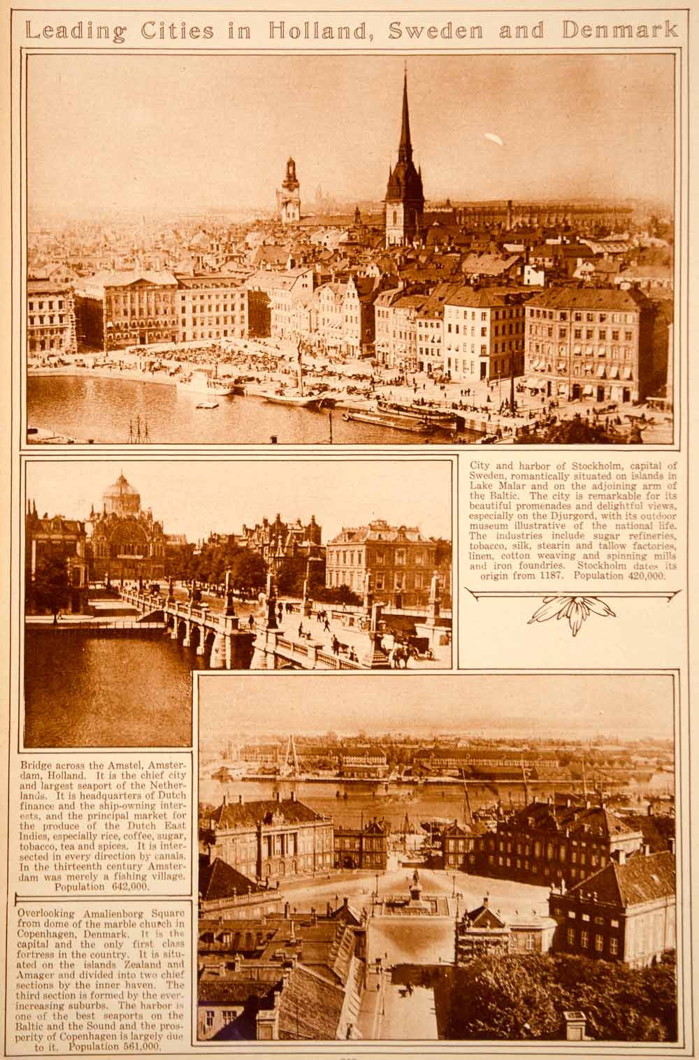 This is an original 1923 sepia rotogravure with three historic city views: the city and harbor of Stockholm, Sweden; the bridge across the Amstel River in Amsterdam, the Netherlands; and a view overlooking Amalienborg Palace Square in Copenhagen, Denmark.
