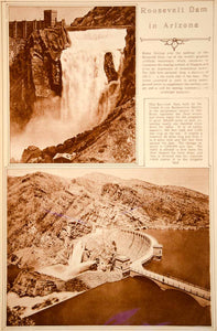This is an original 1923 sepia rotogravure with two views of the Theodore Roosevelt Dam on the Salt River in Arizona.