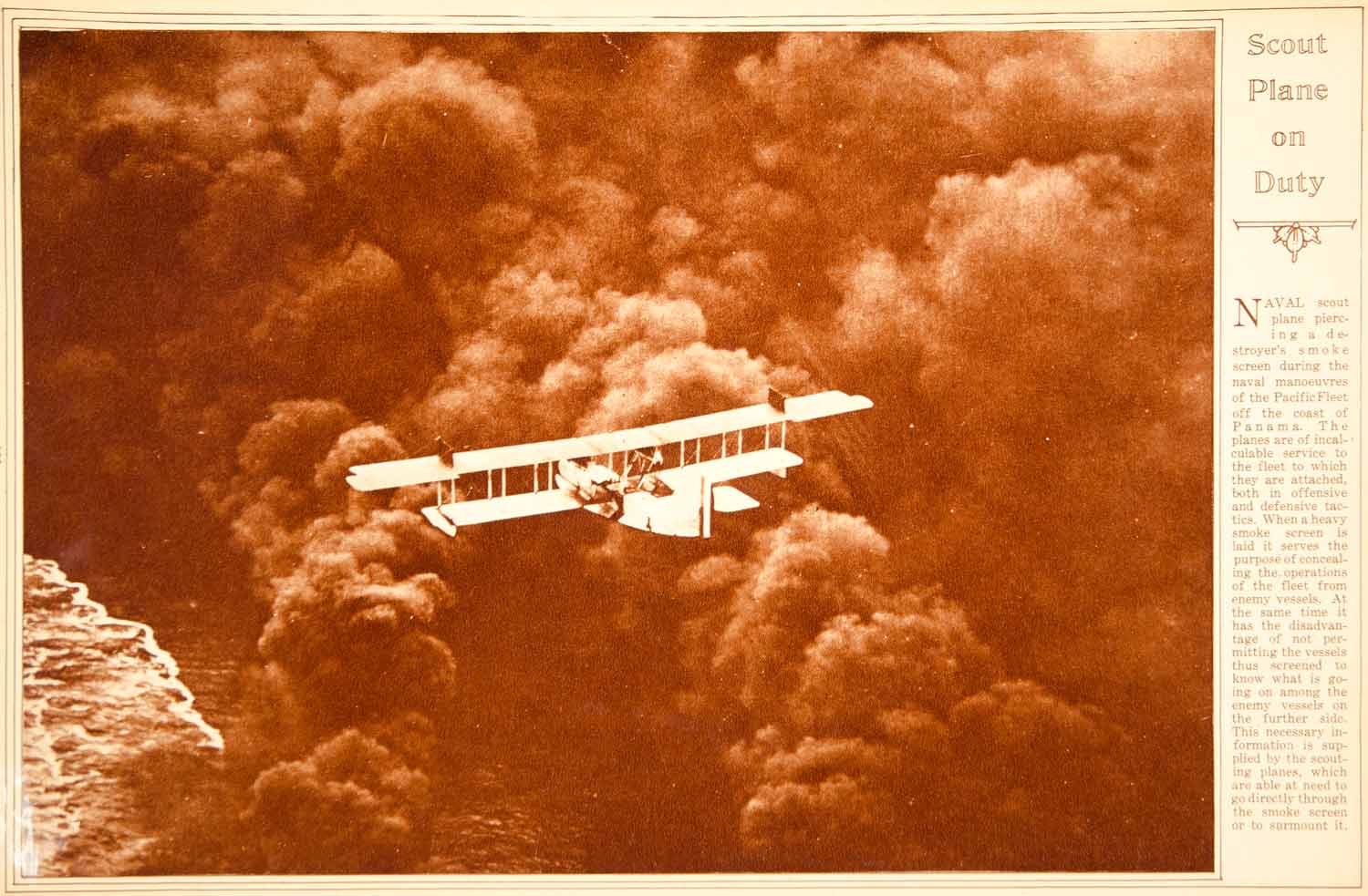This is an original 1923 sepia rotogravure of a dramatic view of a Navy scout plane going through a destroyer's smoke screen during naval maneuvers of the Pacific Fleet off the coast of Panama.