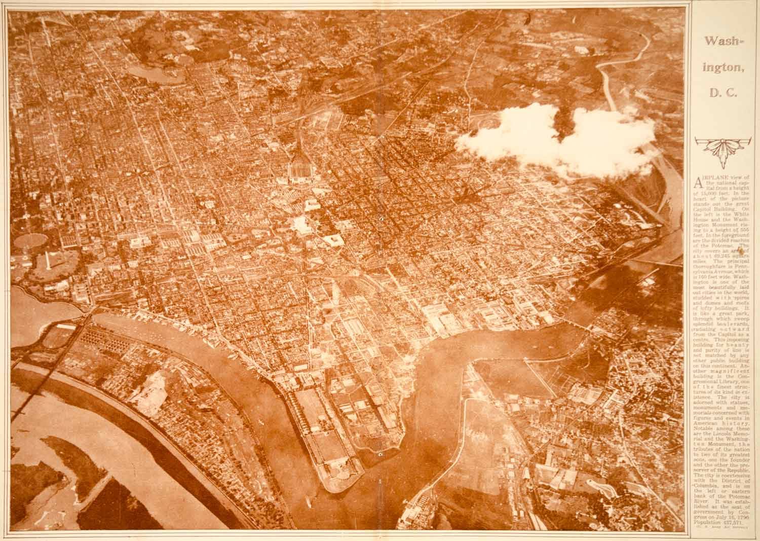 This is an original 1923 double-page sepia rotogravure of an amazing aerial view of the capital city, Washington D.C. along the Potomac River. At the time the population was 437,571.