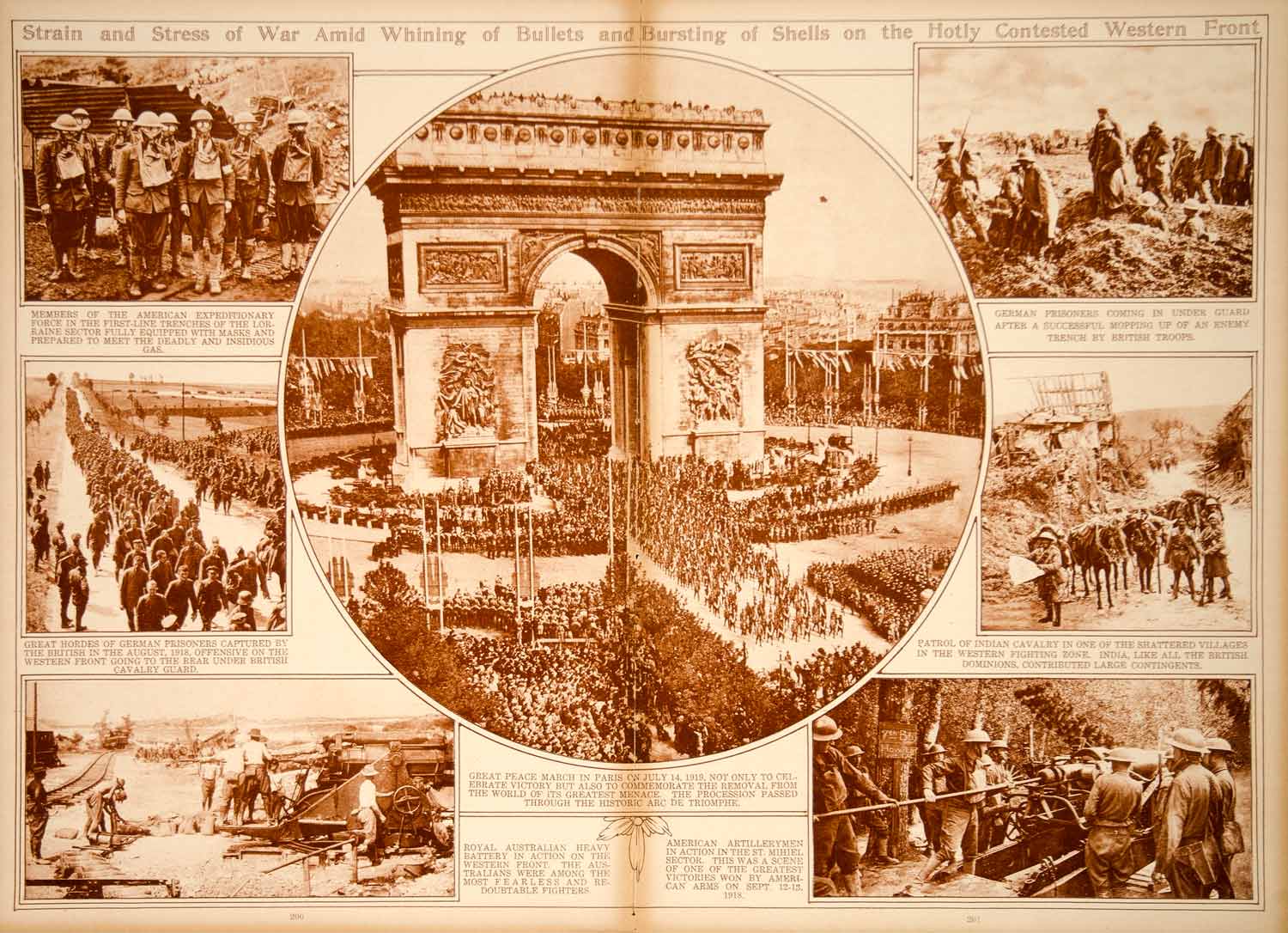 This is an original 1923 double-page sepia rotogravure with images from World War I including: members of the American Expeditionary Forces wearing gas masks; German prisoners of war; Indian cavalry; an Australian heavy battery in action; and the Peace March in Paris on July 14, 1919 passing through the Arc de Triomphe.
