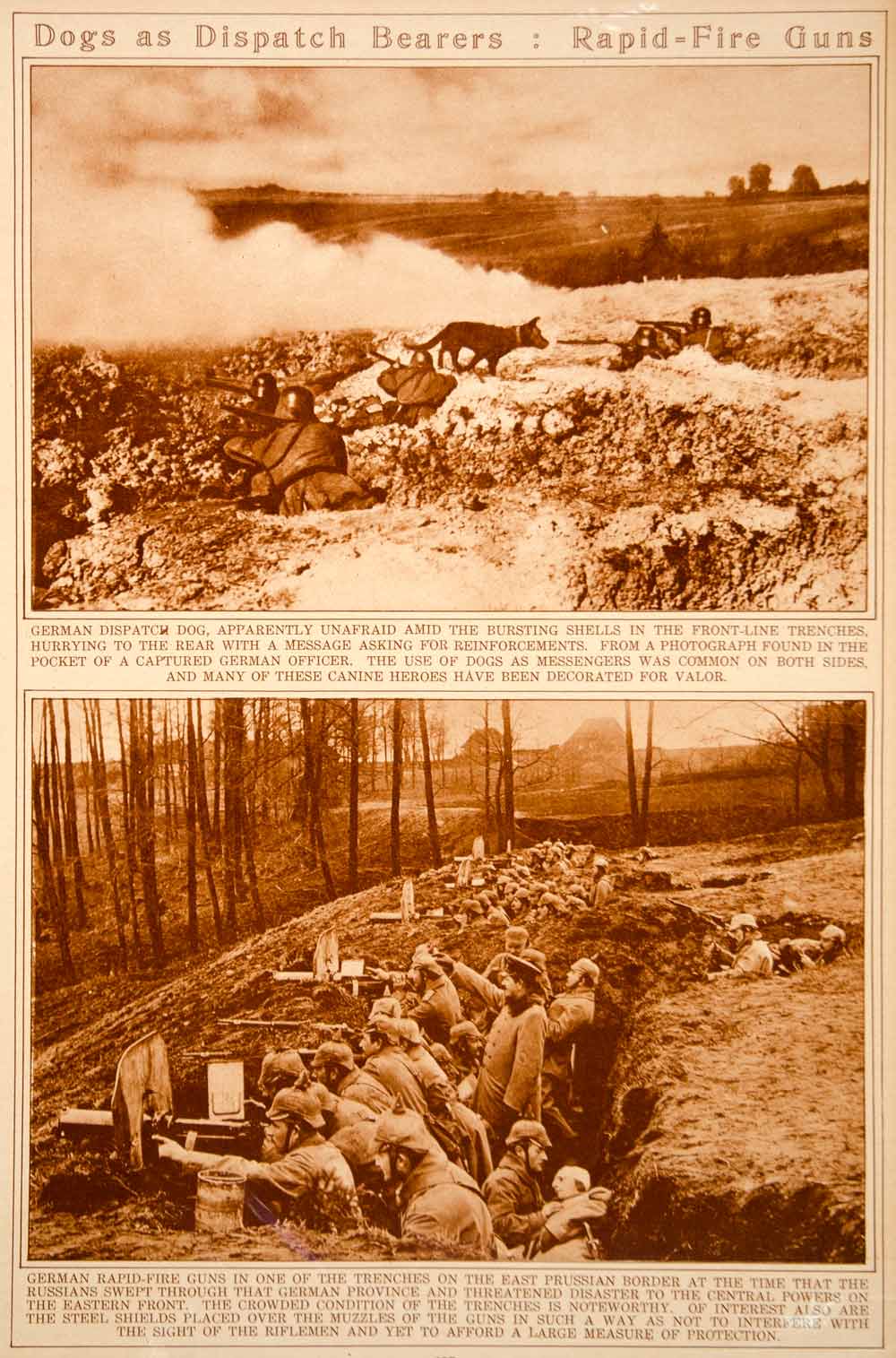 This is an original 1923 sepia rotogravure with two images from World War I: a German dispatch dog bearing a message from the front trenches; and German rapid-fire guns in the trenches on the east Prussian border.