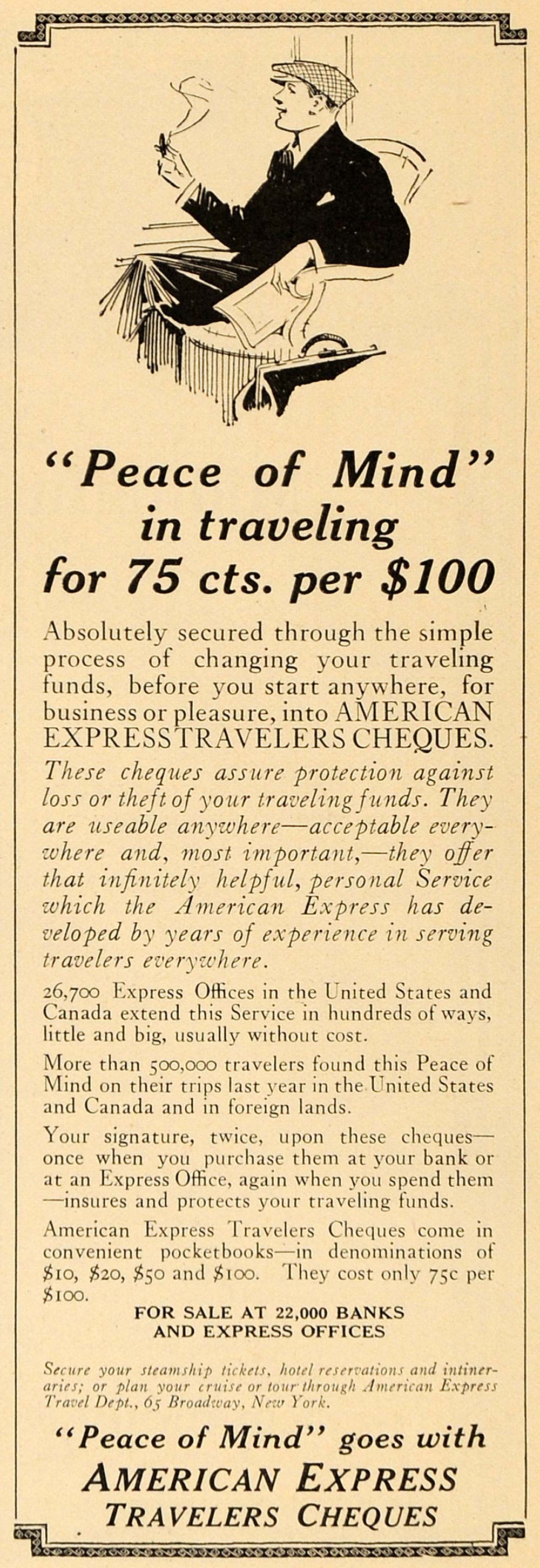 This is an original 1924 black and white print ad for Travelers Checks from American Express which is located in New York.