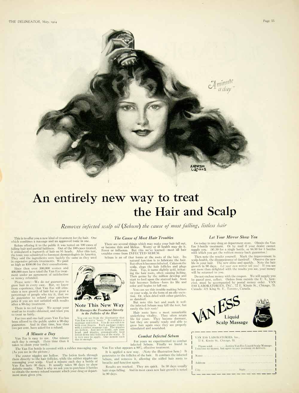 This is an original 1924 black and white print ad for the liquid scalp massage hair treatment that was made and sold by Van Ess Laboratories of 72 East Kinzie Street, Chicago, Illinois (IL) that also featured artwork by Andrew William Loomis.