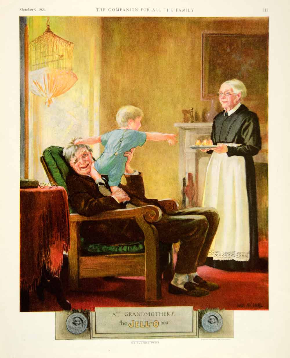This is an original 1924 color print ad for Jell-O gelatin dessert that was made and sold by the Genesee Pure Food Company during the Roaring Twenties era. The ad also features an illustration by Angus Peter MacDonall entitled, "At Grandmothers" that portrays a grandson having Jell-O at his grandparent's house.
