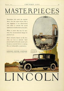 This is an original 1924 color print ad for the Lincoln Motor Company, a division of the Ford Motor Company in Detroit, Michigan. This particular ad features an image of The Cabriolet model, as well as an image of the Brooklyn Bridge, which was first opened in 1883.