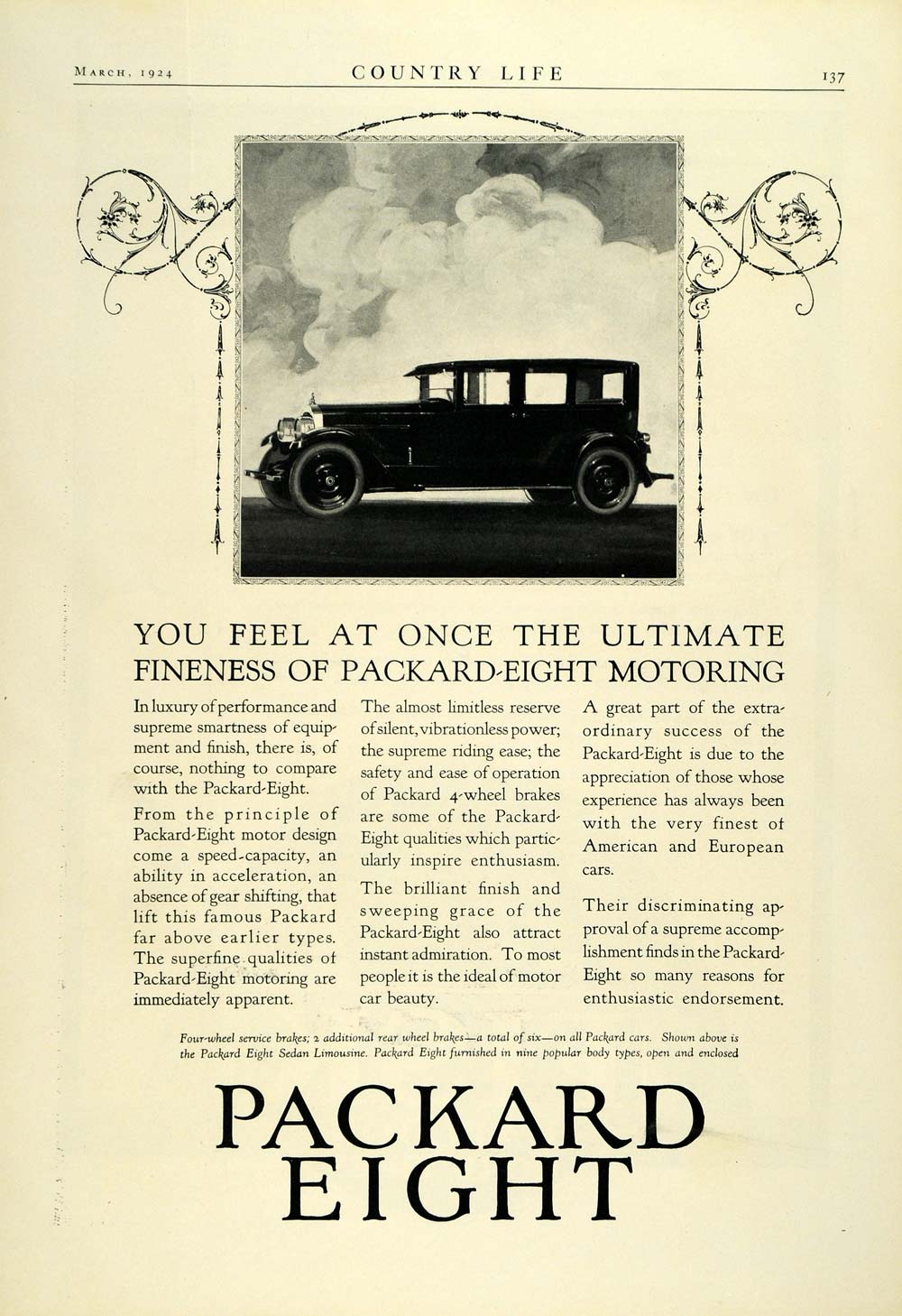 This is an original 1924 black and white print ad for the Packard Eight line of automobiles. This particular ad features an image of the Packard Eight Sedan Limousine.