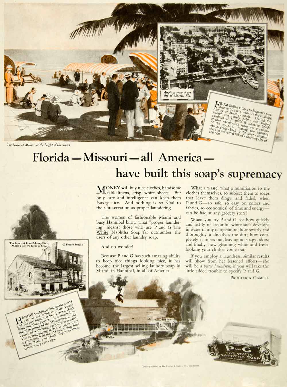 This is an original 1924 two-color print ad for P and G White Naphtha soap that was made and sold by the Procter & Gamble Co. of Cincinnati, Ohio (OH) during the Roaring Twenties era. The ad also features an illustration of a crowded beach in Miami, Florida and a photograph of the home of Mark Twain's famous hero, Huckleberry Finn, in Hannibal, Missouri (MO).
