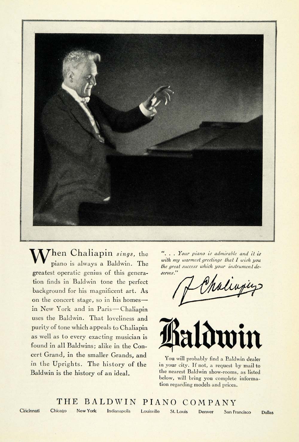 This is an original 1924 black and white print ad for The Baldwin Piano Company, specially featuring a quote from Russian Opera singer Feodor Chaliapin.