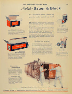 This is an original 1924 color print ad for Bauer & Black sterile gauze, sterile bandages, sterile absorbent cotton and adhesive plaster. Bauer & Black, Makers of Sterile Surgical Dressings and Allied Products, located in Chicago, New York and Toronto.