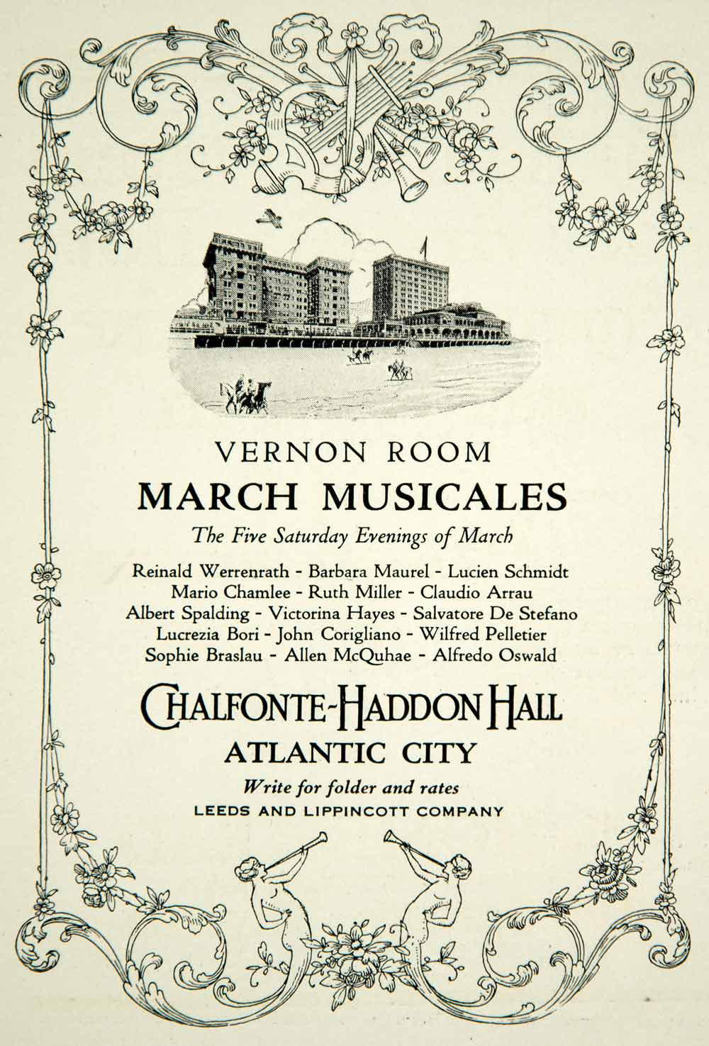 Keywords specific to this image: Vintage Advertising, Music, Instrument, Harp, Lyre, Art Nouveau, Trumpet, Herald, March Musicales, Reinald Werrenrath, Barbara Maurel, Lucien Schmidt, Mario Chamlee, Ruth Miller, Claudio Arrau, Albert Spalding, Victorina Hayes, Salvatore De Stefano, Lucrezia Bori, John Corigliano, Wilfred Pelletier, Sophie Braslau, Allen McQuhae, Alfredo Oswald, Company, Building, Entertainer, Performance, Show, Resort, Hotel, Casino, NJ, New Jersey, Quaker Rooming Houses, Skyscraper, Architecture, Addison Hutton