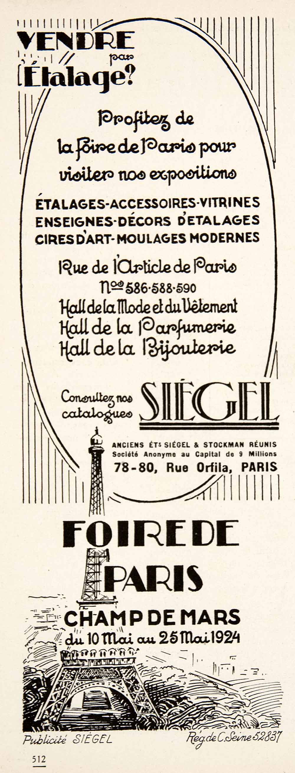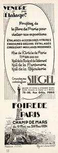 This is an original 1924 black and white print ad for the Foire de Paris (Paris Fair), and one of the exhibitors, Siégel.