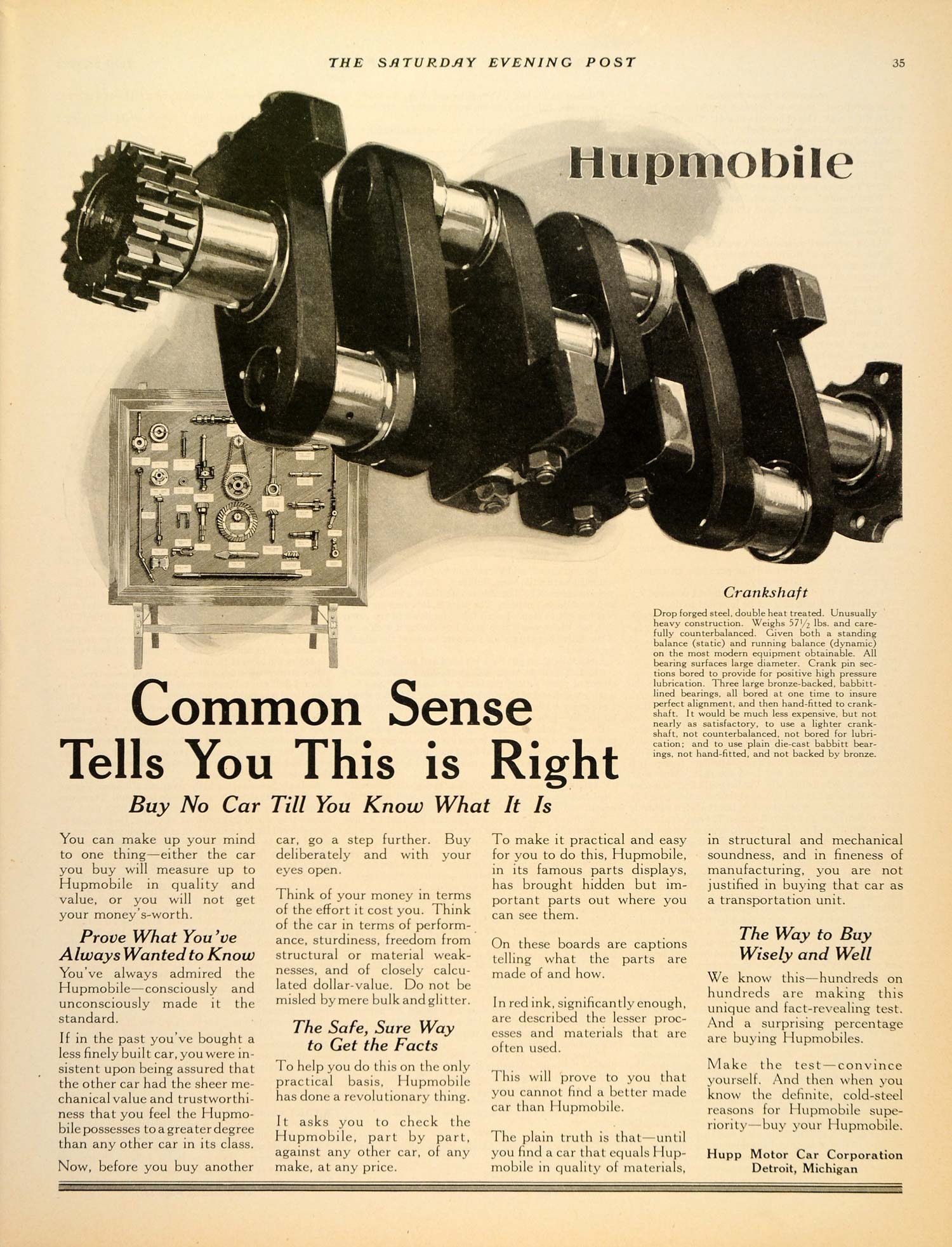 This is an original 1924 black and white print ad for the Hupmobile by Hupp Motors in Detroit, Michigan. An interesting aspect of this ad is that it doesn't actually picture its automobile, but rather just the Crankshaft.