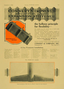 This is an original 1924 color print ad for Connery's Improved Accordion Type Expansion Stiffener for breechings, smoke flues and air ducts. This ad features an image of the partial installation at the Ohio Power Company with engineers Sargent and Lundy.