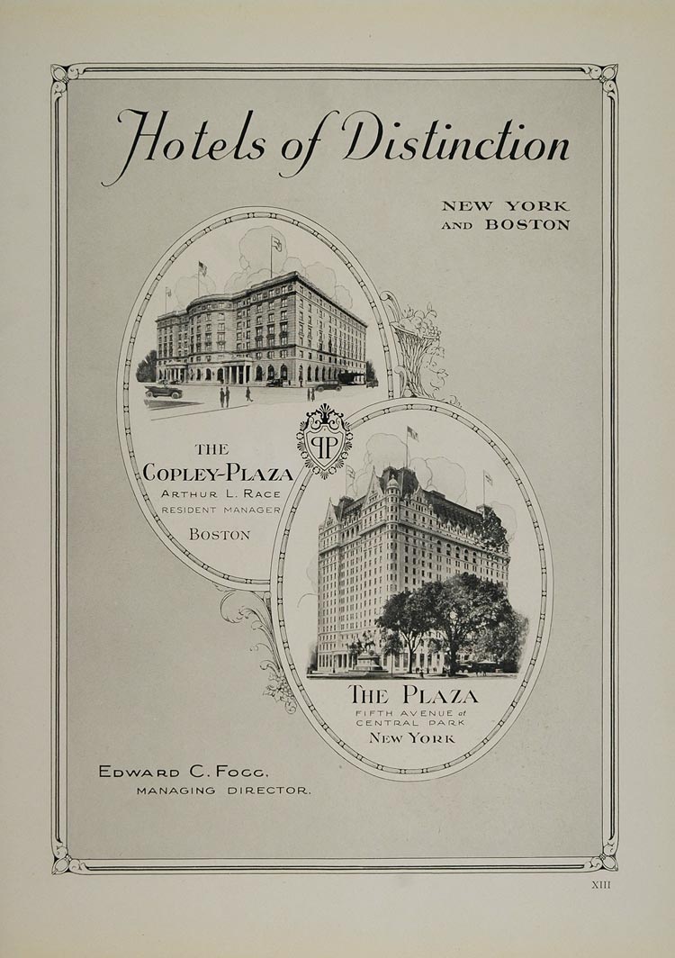 This is an original 1924 black and white print ad for two hotels of distinction--The Copley-Plaza of Boston, Arthur L. Race, Resident Manager; and The Plaza of New York City. Edward C. Fogg, Managing Director.